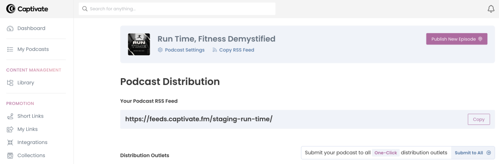 In your Captivate or podcast hosting dashboard, click Copy RSS Feed at the top of the page to copy the link to your clipboard.