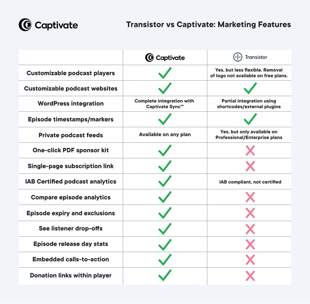 Yes, it’s a bit less than Transistor, but we don’t hold back extra features behind paid upgrades and Captivate has a significant range of features you simply won’t find at Transistor, each built to help you to grow your podcast.